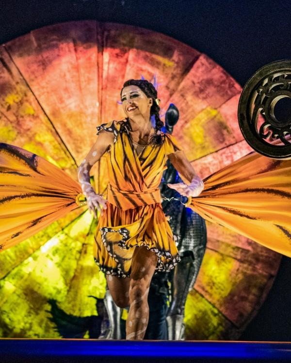In a majestic display of grace and strength, the Running Woman spreads her wings in tribute to the annual migration of the monarch butterfly from southern Canada to central Mexico. With this simple expression, show creators found a subtle and artistic way to link the Canadian-based Cirque du Soleil with the nation of Mexico.