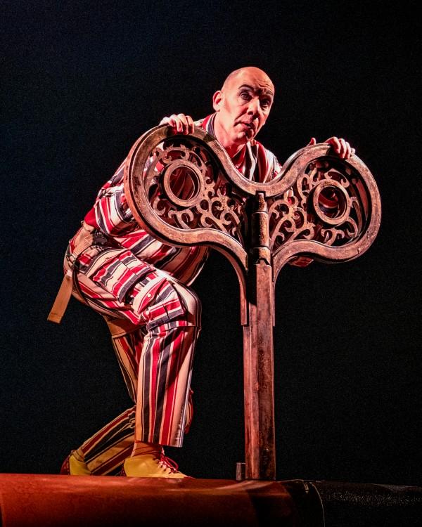 Under a luminous red moon, artists perform a stunning Russian swing act. For the first time at Cirque du Soleil, the two swings are mounted on a turntable so that the audience can enjoy the performance from all angles. The pushers demonstrate impeccable timing by flinging their partners up to 10 meters (33 feet) in the air.